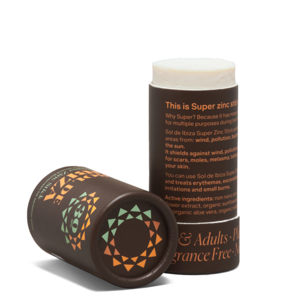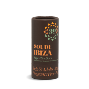 Sol de Ibiza Super Zinc päikesekaitsepulk SPF30 on igapäevaseks kasutamiseks loodud mineraalne päikesekaitse näole ja kehale, mis on pakendatud plastivabasse ja 100% biolagunevasse kartongkarpi. Selle looduslik tsinkoksiidfilter pakub laia spektriga UVA- ja UVB-kaitset, olles ohutu nii nahale kui ka keskkonnale.